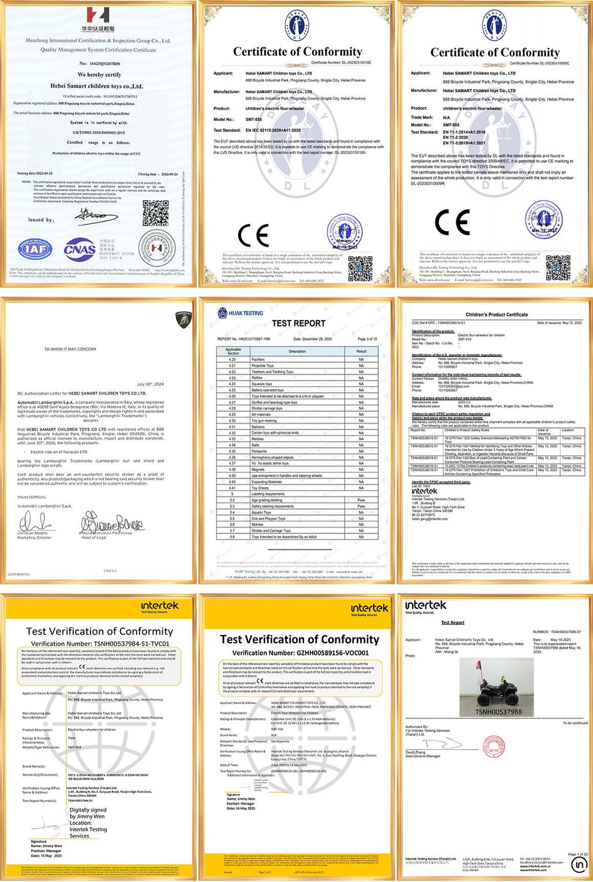 “ISO9001” ,"CCC", CE, EN71, EN62115, EMC, ROHS, ASTM -F963, CPC and other certifications.