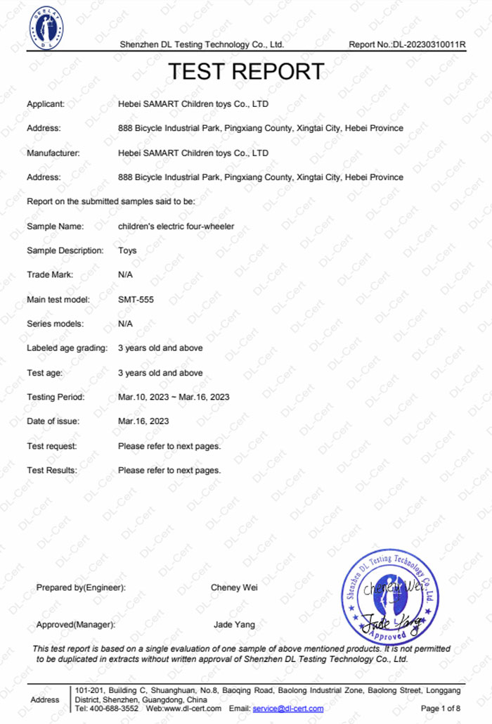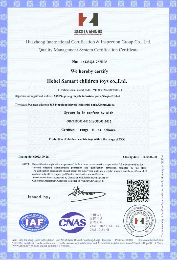 Hebei Samart Children Toys Co., Ltd. is a professional and technological company in the development, production and sales of high-end Ride-on cars. Founded in 2013, with a registered capital of 5 million, it is located in No. 888, Hegumiao Industrial Park, Pingxiang County, Xingtai City, Hebei China. Covered 30,000 square meters, and the existing employees are more than 100 workers and more than 20 professional and technical personnel. It has one invention patent, more than 10 utility model patents and more than 20 appearance patents. It is a "National high-tech enterprise".