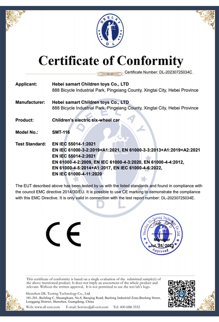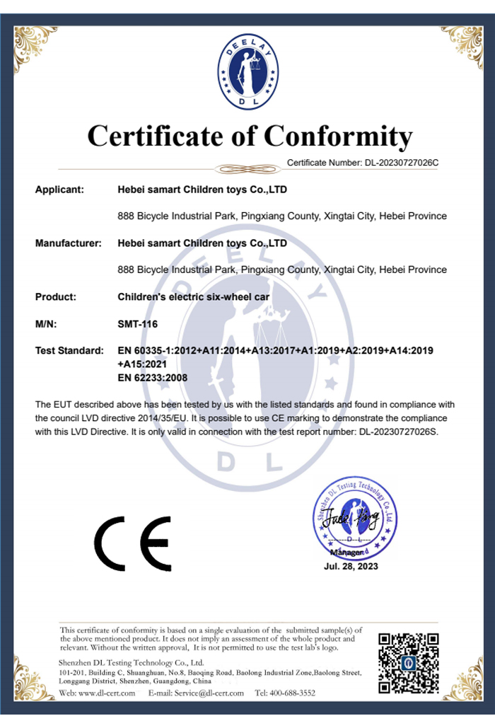 “ISO9001” ,"CCC", CE, EN71, EN62115, EMC, ROHS, ASTM -F963, CPC and other certifications.